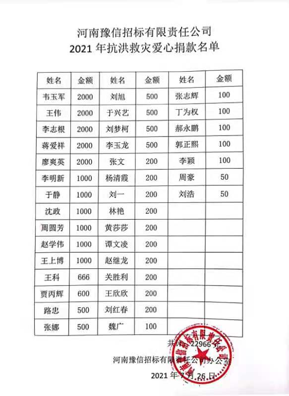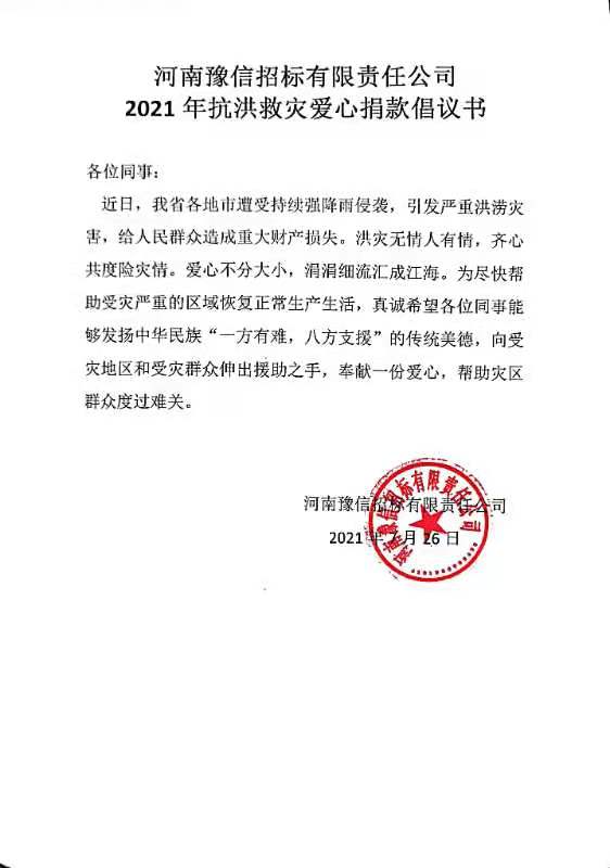 受超強(qiáng)降雨影響,目前河南省內(nèi)抗洪救災(zāi)仍在繼續(xù)!我省仍有多地汛情嚴(yán)峻,身為河南本土國有企業(yè),河南豫信招標(biāo)有限責(zé)任公司 號召 公司干部職工 以實(shí)際行動幫助災(zāi)區(qū)人民抗洪救災(zāi)、重建家園 。