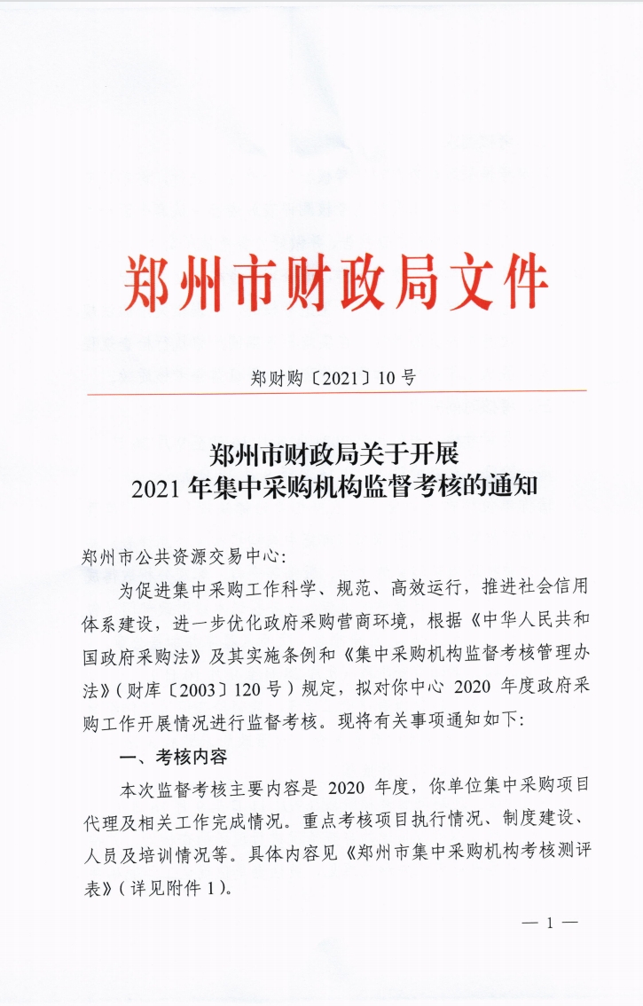 鄭州市財政局 關(guān)于開展2021年集中采購機構(gòu)監(jiān)督考核的通知