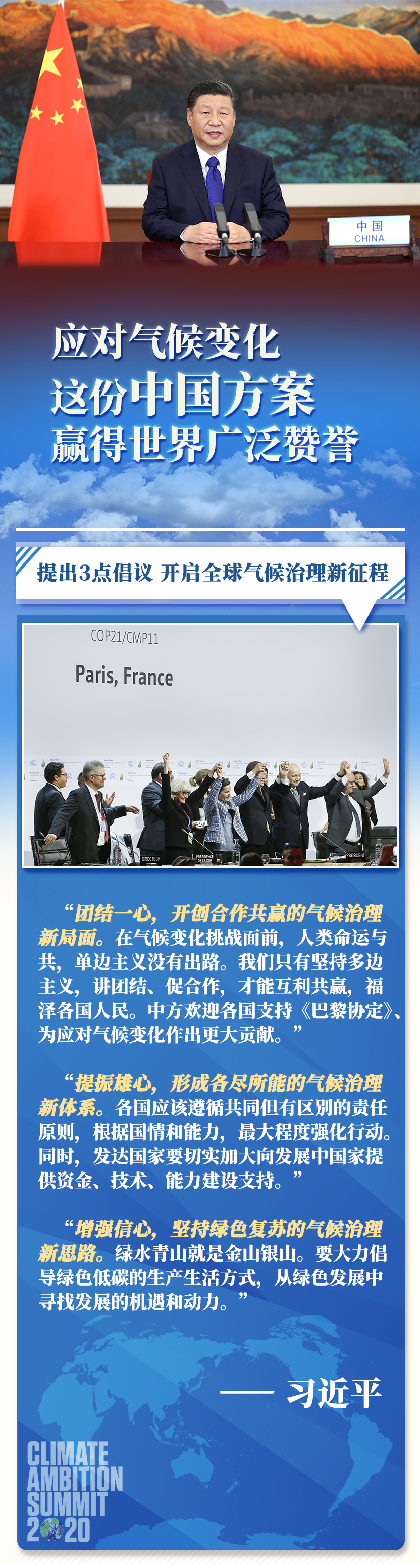 海外各界人士表示,習(xí)主席的重要講話為全球氣候治理提振雄心并提供新思路,彰顯中國與世界各國攜手助力《巴黎協(xié)定》行穩(wěn)致遠的決心,展現(xiàn)了中國重信守諾、為全球應(yīng)對氣候變化作出更大貢獻的大國擔(dān)當。