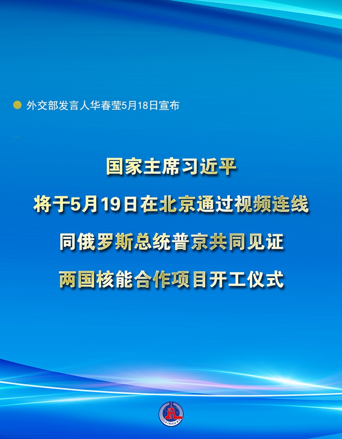 新華社北京5月18日電 外交部發(fā)言人華春瑩18日宣布:國家主席習(xí)近平將于5月19日在北京通過視頻連線,同俄羅斯總統(tǒng)普京共同見證兩國核能合作項目開工儀式。