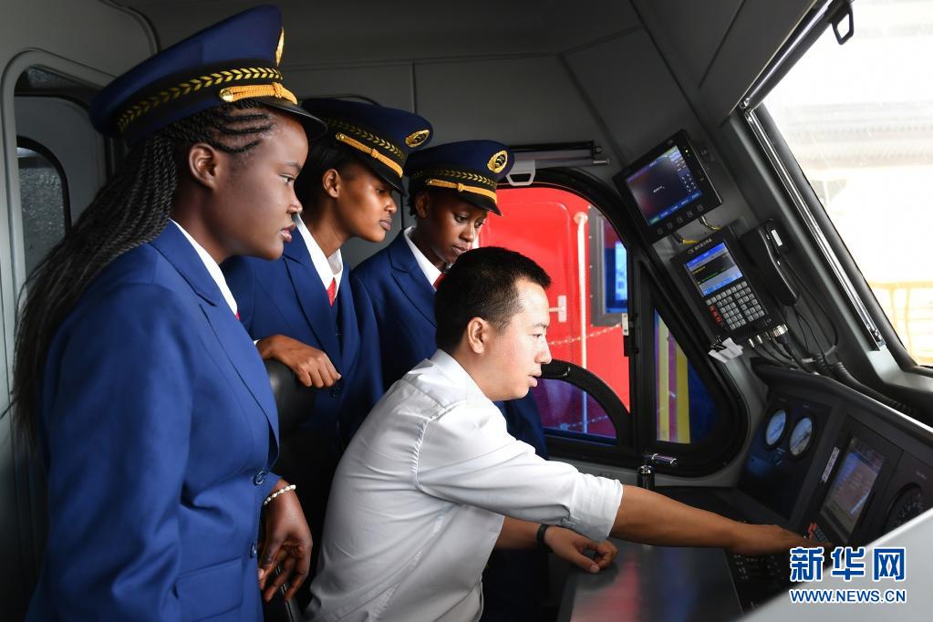 在肯尼亞內(nèi)羅畢,肯尼亞火車司機(jī)跟隨中國(guó)老師張程熟悉操作流程(2017年5月17日攝)。新華社記者 孫瑞博 攝
