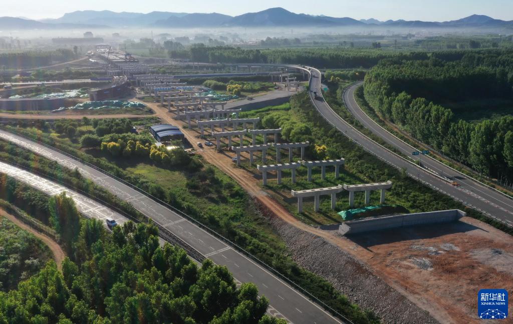 這是6月6日在遵化市境內(nèi)拍攝的京秦高速公路遵(遵化)秦(秦皇島)段與唐(唐山)承(承德)高速下院寺樞紐互通建設(shè)工地(無(wú)人機(jī)照片)。新華社記者 楊世堯 攝