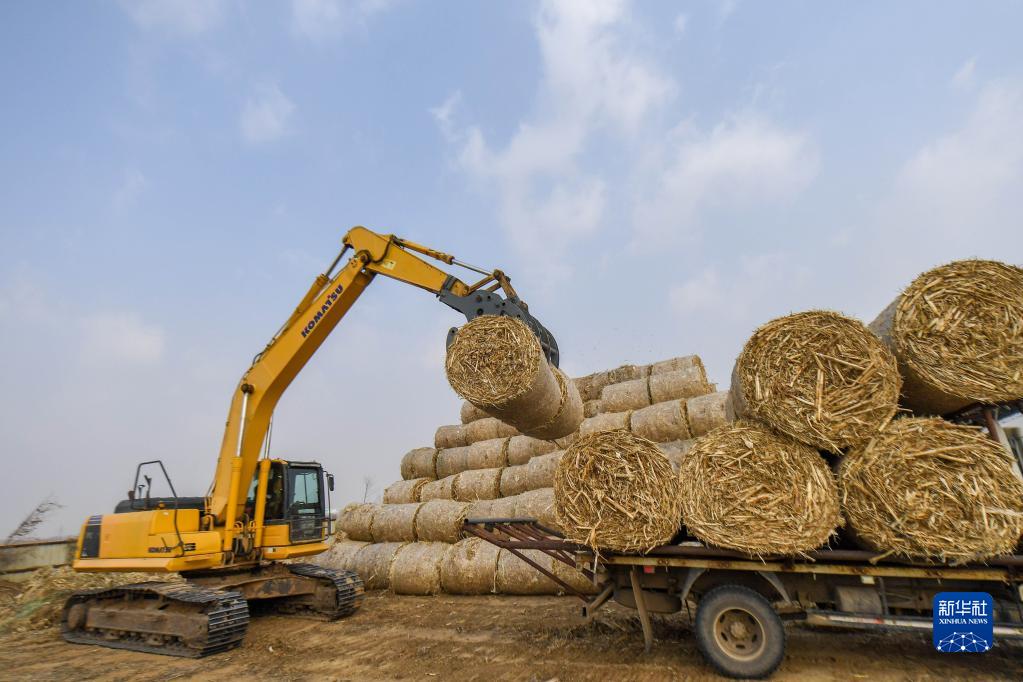 2020年11月12日,在吉林省四平市福港秸稈收儲有限公司,農(nóng)業(yè)機(jī)械搬運打包好的秸稈。新華社記者 張楠 攝