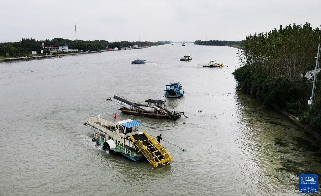蘇浙滬三地的保潔船在位于長三角生態(tài)綠色一體化發(fā)展示范區(qū)的蘇浙滬交界水域太浦河流域聯(lián)合清理水面浮游植物(2020年10月15日攝,無人機(jī)照片)。新華社記者 方喆 攝