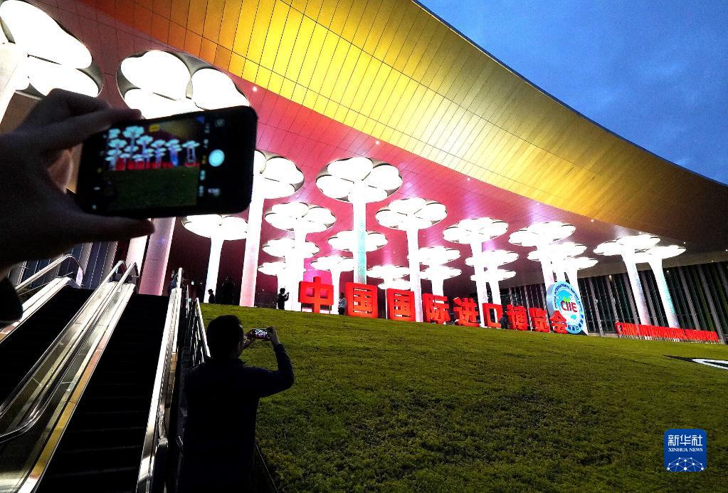 2018年11月4日,人們?cè)谂臄z國家會(huì)展中心(上海)場(chǎng)館夜景。2018年11月5日,首屆中國國際進(jìn)口博覽會(huì)在上海開幕。新華社記者 陳飛 攝