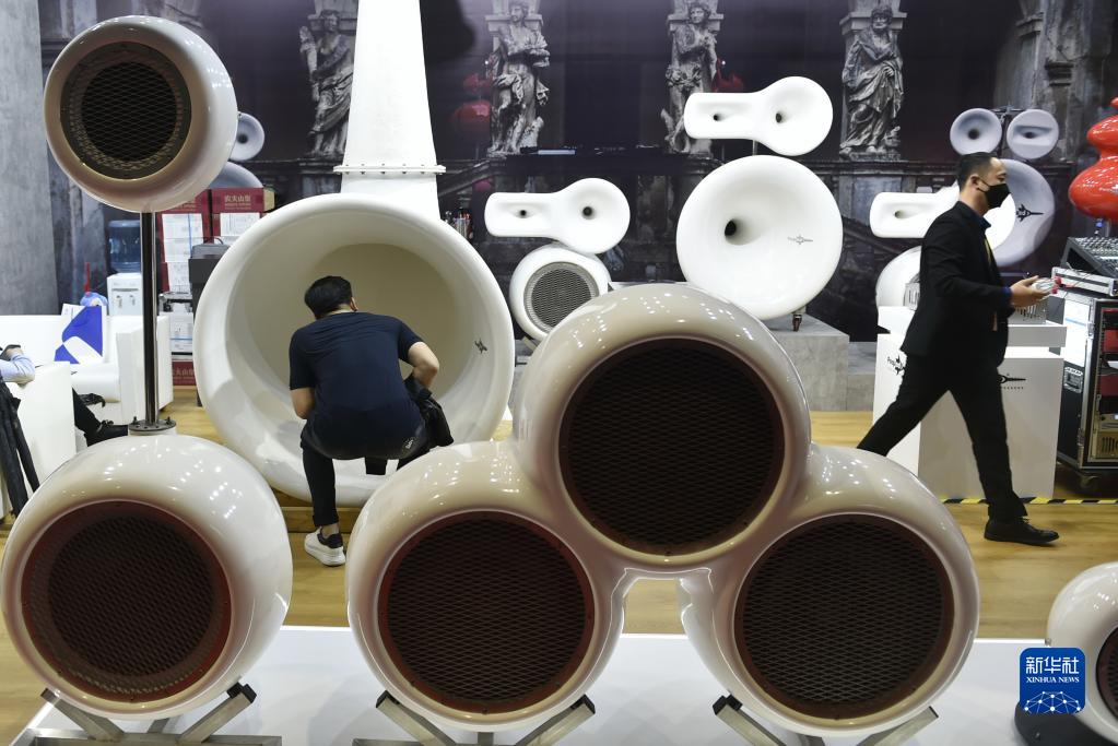 11月6日,參會(huì)者在第四屆進(jìn)博會(huì)展館里的意大利PEQUOD公司展位參觀音響設(shè)備。PEQUOD公司首次參展進(jìn)博會(huì)。新華社記者 魯鵬 攝