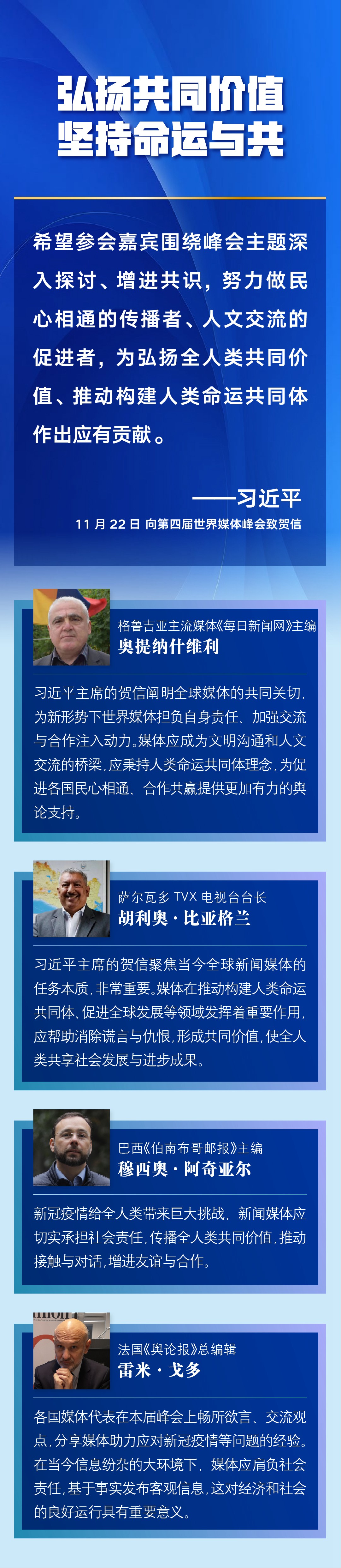 多國(guó)媒體人士認(rèn)為,習(xí)近平主席的賀信對(duì)全球媒體更好肩負(fù)社會(huì)責(zé)任、廣泛凝聚世界共識(shí)作出重要闡述,為新形勢(shì)下世界媒體加強(qiáng)交流與合作、弘揚(yáng)全人類共同價(jià)值、推動(dòng)構(gòu)建人類命運(yùn)共同體注入新的推動(dòng)力——