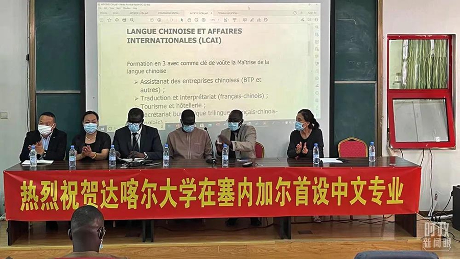 △2021年11月23日,塞內(nèi)加爾達喀爾大學(xué)在孔子學(xué)院舉行了中文專業(yè)推介暨新聞發(fā)布會,這標志著中文教育正式進入塞內(nèi)加爾高等教育體系。(總臺記者韓蓄拍攝)