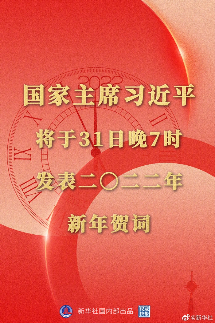 新華社北京12月30日電 國家主席習近平將于31日晚7時通過中央廣播電視總臺和互聯(lián)網(wǎng),發(fā)表二〇二二年新年賀詞。中央廣播電視總臺所屬中央電視臺綜合頻道、新聞頻道、中文國際頻道、4K頻道,中國國際電視臺各外語頻道,中央人民廣播電臺,中國國際廣播電臺,以及人民網(wǎng)、新華網(wǎng)、央視新聞客戶端等中央主要新聞媒體所屬網(wǎng)站、新媒體平臺將準時播出。