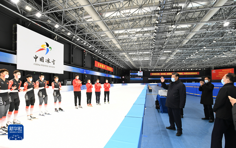 2022年1月4日,中共中央總書記、國家主席、中央軍委主席習(xí)近平在北京考察2022年冬奧會、冬殘奧會籌辦備賽工作。這是4日下午,習(xí)近平在二七廠冰雪項目訓(xùn)練基地速滑館,向參訓(xùn)運動員、教練員表示慰問。新華社記者 謝環(huán)馳 攝