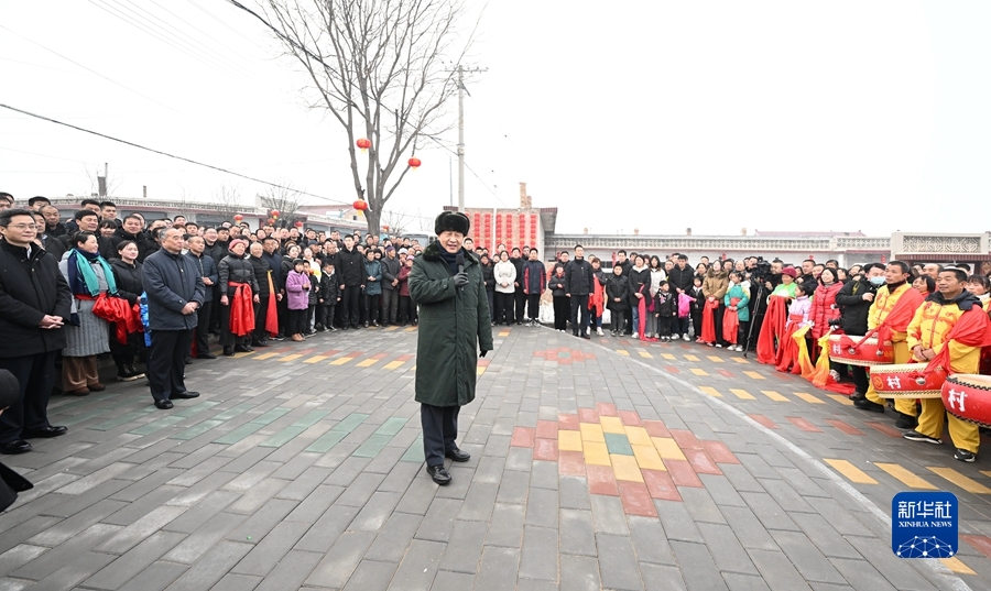 村文化廣場上十分熱鬧,村民們打起威風(fēng)鑼鼓、扭起秧歌歡慶佳節(jié)??吹娇倳泚砹?,人們高興地歡呼起來。習(xí)近平對(duì)鄉(xiāng)親們說,我們黨的根本宗旨就是為人民群眾辦好事,為人民群眾幸福生活拼搏、奉獻(xiàn)、服務(wù)。我們?nèi)缙诖蜈A了脫貧攻堅(jiān)戰(zhàn),如期實(shí)現(xiàn)了全面建成小康社會(huì)目標(biāo),現(xiàn)在踏上了全面建設(shè)社會(huì)主義現(xiàn)代化國家新征程。建設(shè)現(xiàn)代化國家離不開農(nóng)業(yè)農(nóng)村現(xiàn)代化,要繼續(xù)鞏固脫貧攻堅(jiān)成果,扎實(shí)推進(jìn)鄉(xiāng)村振興,讓群眾生活更上一層樓,在推進(jìn)農(nóng)業(yè)農(nóng)村現(xiàn)代化中越走越有奔頭。