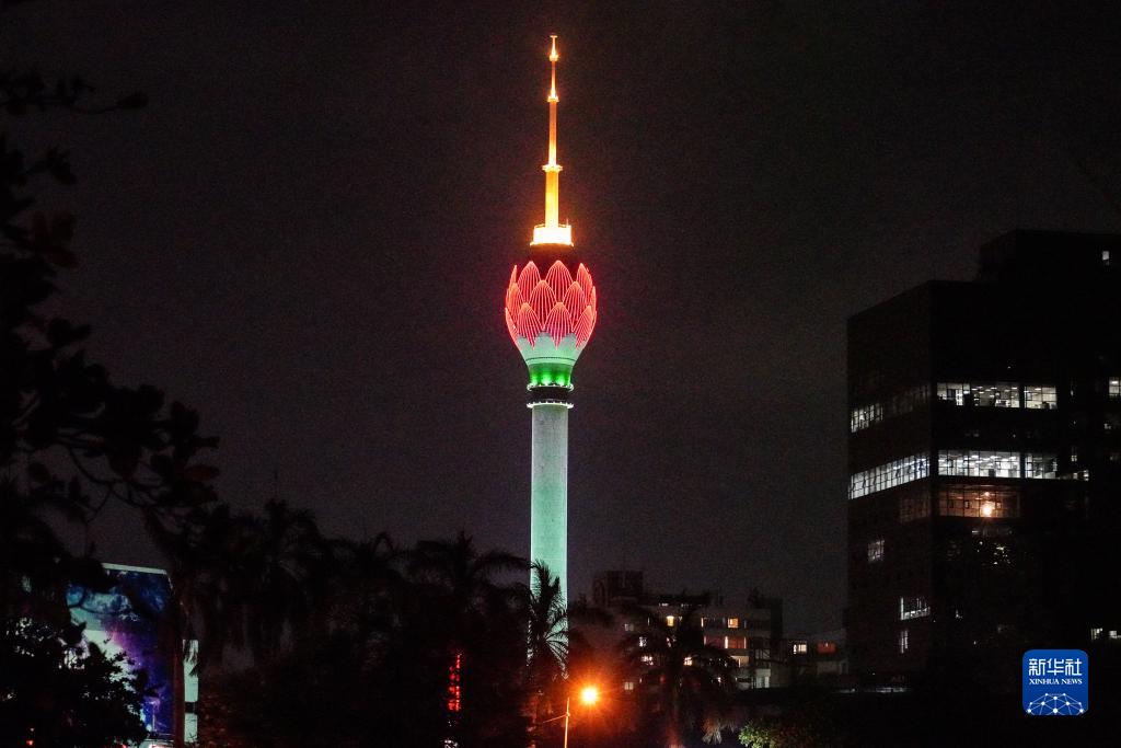 這是1月31日在斯里蘭卡科倫坡拍攝的點(diǎn)亮“中國(guó)紅”的蓮花電視塔。新華社記者 唐璐 攝