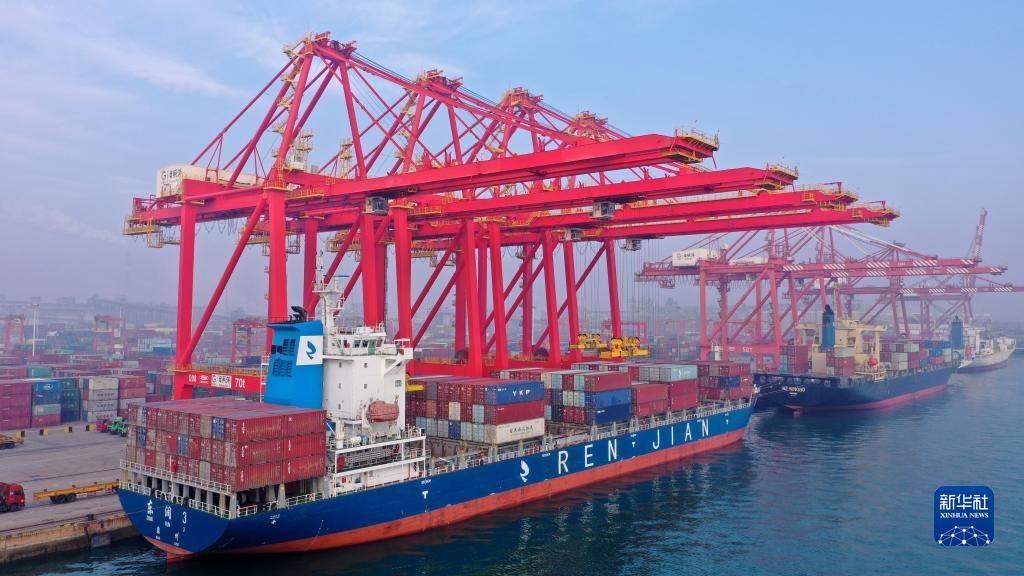 1月26日,貨輪??吭谏綎|日照港集裝箱碼頭進(jìn)行裝卸作業(yè)(無人機(jī)照片)。新華社記者 郭緒雷 攝