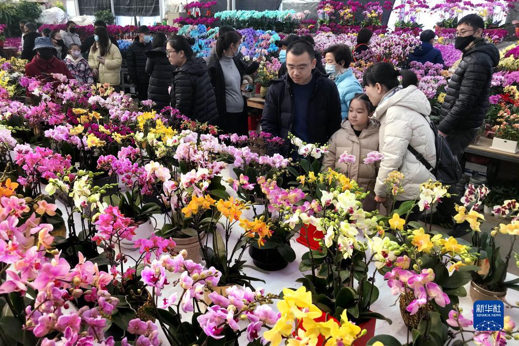 1月16日,顧客在青島市嶗山區(qū)一花卉市場(chǎng)“年宵花節(jié)”上挑選鮮花。新華社記者 李紫恒 攝