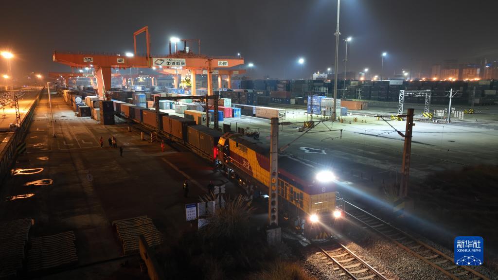 這是1月28日晚在成都拍攝的中歐班列(無人機(jī)照片)。新華社發(fā)(白桂斌 攝)
