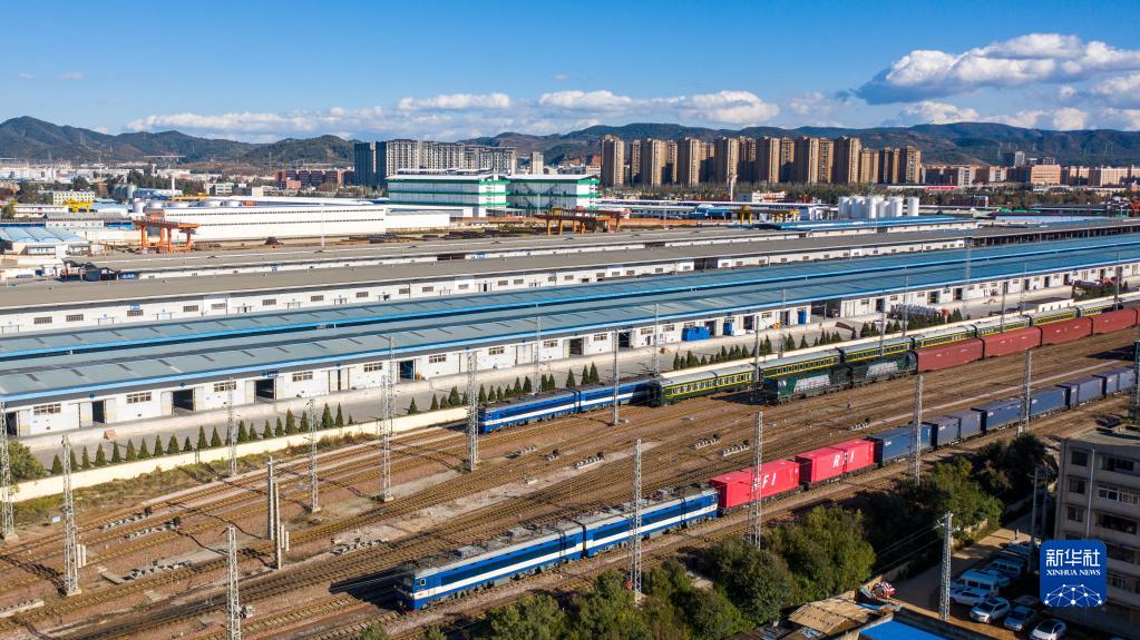 1月1日,滿載30個(gè)標(biāo)準(zhǔn)集裝箱的中老鐵路新年首趟國(guó)際貨物列車(前)從昆明開往老撾萬(wàn)象(無人機(jī)照片)。新華社記者 胡超 攝
