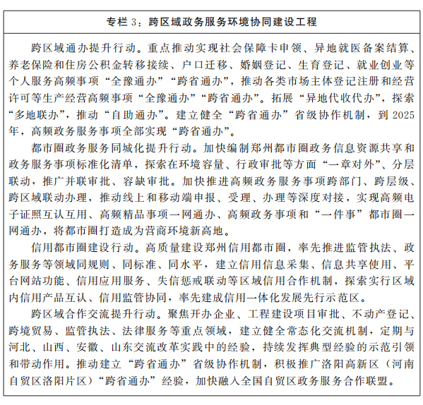 提升政務(wù)服務(wù)便利度。加快推進(jìn)政務(wù)服務(wù)標(biāo)準(zhǔn)化,持續(xù)優(yōu)化《河南省政務(wù)服務(wù)事項基本目錄》,制定全省統(tǒng)一的政務(wù)服務(wù)標(biāo)準(zhǔn)化實施細(xì)則,全面建成與國家和行業(yè)標(biāo)準(zhǔn)體系協(xié)調(diào)一致、結(jié)構(gòu)統(tǒng)一,覆蓋省、市、縣、鄉(xiāng)、村五級的政務(wù)服務(wù)標(biāo)準(zhǔn)化體系,實現(xiàn)同一事項全省無差別受理、同標(biāo)準(zhǔn)辦理,爭創(chuàng)一批政務(wù)服務(wù)標(biāo)準(zhǔn)化國家級試點。優(yōu)化再造政務(wù)服務(wù)流程,持續(xù)壓縮政務(wù)服務(wù)事項辦理時限,全面推行一窗通辦、一網(wǎng)通辦、全程網(wǎng)辦服務(wù)模式,推出一批憑營業(yè)執(zhí)照和居民身份證可自助辦理的“無人審批”事項,推動實現(xiàn)全省除涉密之外的所有政務(wù)服務(wù)事項實行“不見面審批”、市縣級政務(wù)服務(wù)事項“一窗”分類受理全覆蓋?!笆奈濉逼陂g,普通高壓客戶辦電環(huán)節(jié)壓縮至4個以內(nèi),其中符合投資至規(guī)劃紅線要求的辦電環(huán)節(jié)壓縮至3個以內(nèi),對通過工商信息推送“主動辦電”的辦電環(huán)節(jié)壓縮至2個以內(nèi)。用水、用氣報裝(含施工)環(huán)節(jié)分別壓縮至2個、3個。精簡辦事材料,全面清理證明事項和推行證明事項告知承諾制,推廣應(yīng)用以信用為基礎(chǔ)的容缺受理機(jī)制,創(chuàng)建一批“無證明城市”。創(chuàng)新政務(wù)服務(wù)模式,探索無人工干預(yù)的智慧審批、“無感智辦”等新模式,逐步拓展“秒報”“秒批”服務(wù)事項范圍和“最小顆?;闭?wù)服務(wù)事項覆蓋面,加快互聯(lián)網(wǎng)應(yīng)用適老化及無障礙改造升級。實施跨區(qū)域政務(wù)服務(wù)通辦提升行動,聚焦保障改善民生,加快統(tǒng)一通辦業(yè)務(wù)規(guī)則和標(biāo)準(zhǔn),優(yōu)化通辦業(yè)務(wù)模式,推動更多政務(wù)服務(wù)事項“同事同標(biāo)”,實現(xiàn)企業(yè)和群眾高頻事項“全豫通辦”“跨省通辦”。到2025年,政務(wù)服務(wù)事項“一網(wǎng)通辦”可辦率、“最多跑一次”實現(xiàn)率均達(dá)到100%,出口退稅平均辦理時間壓縮至3個工作日以內(nèi),普通高壓客戶辦電(不含配套工程施工)、用水報裝(含施工)、用氣報裝(小型含外線施工)耗時分別壓縮至18個、10個、10個工作日。