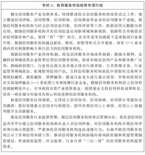 加速培育壯大一批具有較強市場公信力和影響力的信用服務(wù)機(jī)構(gòu),打造一批特色鮮明、相對集聚的信用服務(wù)產(chǎn)業(yè)園區(qū),形成強大的信用生態(tài)鏈。加強信用服務(wù)機(jī)構(gòu)引進(jìn)來和“走出去”,引進(jìn)國內(nèi)外知名信用服務(wù)機(jī)構(gòu),設(shè)立省級征信公司,鼓勵省內(nèi)信用服務(wù)機(jī)構(gòu)參與國內(nèi)跨區(qū)域信用合作和國際競爭,增加高水平信用服務(wù)供給,提升信用服務(wù)機(jī)構(gòu)規(guī)模優(yōu)勢。