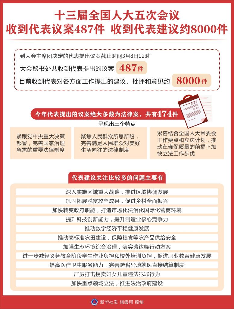 新華社北京3月9日電 記者9日從十三屆全國人大五次會(huì)議秘書處獲悉,到大會(huì)主席團(tuán)決定的代表提出議案截止時(shí)間3月8日12時(shí),大會(huì)秘書處共收到代表提出的議案487件。此外,目前收到代表對(duì)各方面工作提出的建議、批評(píng)和意見約8000件。