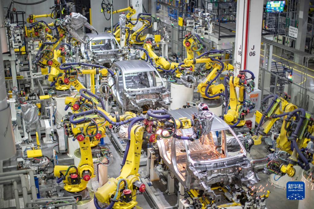 重慶一家新能源汽車企業(yè)使用智能化焊接機器人進行焊接作業(yè)(2021年4月2日攝)。新華社記者 黃偉 攝