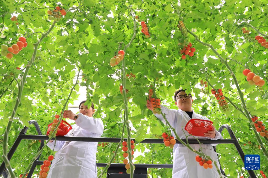 2022年2月18日,湖南省東安縣華維節(jié)水公司智慧農(nóng)業(yè)大棚內(nèi),員工們采摘圣女果準備上市。新華社發(fā)(嚴潔攝)