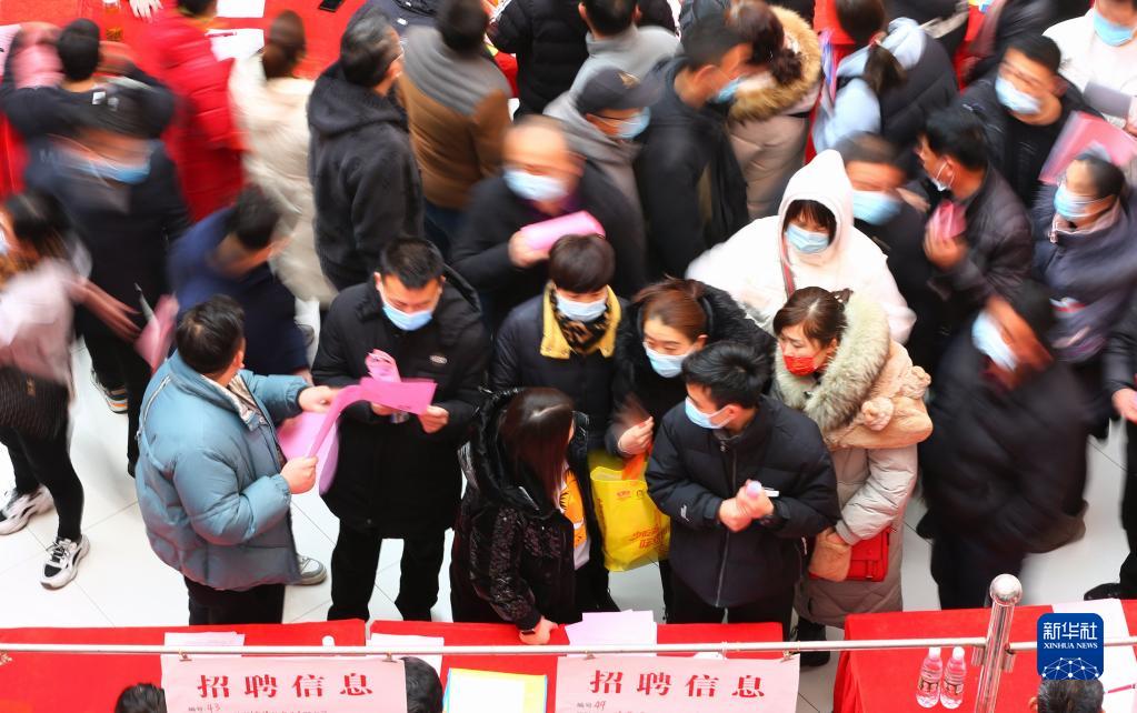2022年2月19日,求職人員在山東省滕州市“春風送崗”春季人才招聘會上尋找就業(yè)崗位。新華社發(fā)(李志軍攝)
