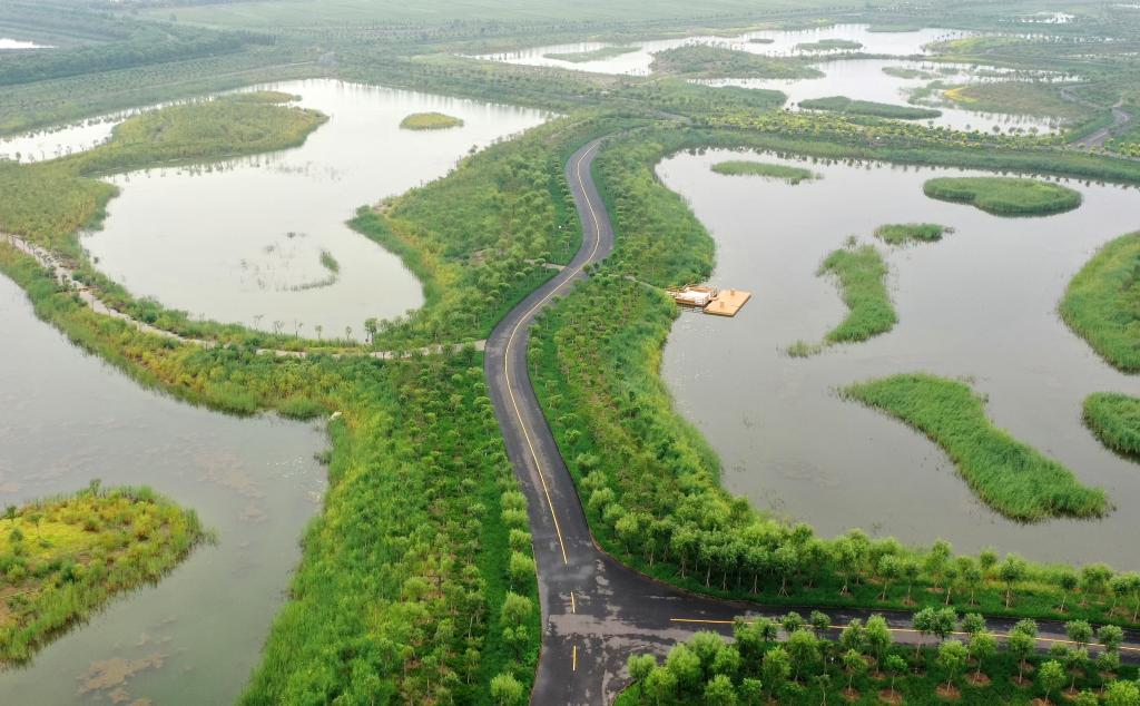 天津西青生態(tài)廊道一景(2021年8月16日攝,無(wú)人機(jī)照片)。新華社記者 李然 攝