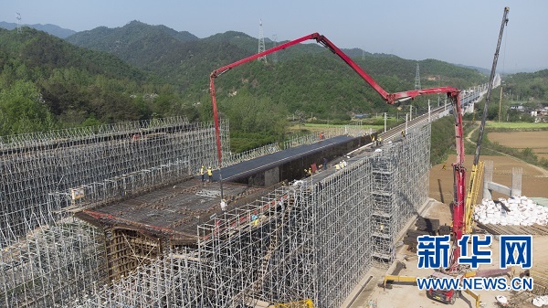 “此次一次性澆筑的混凝土約1100噸,由于澆筑過程時(shí)間長,技術(shù)人員須嚴(yán)格按照技術(shù)交底指導(dǎo)現(xiàn)場施工,認(rèn)真落實(shí)安全質(zhì)量責(zé)任制,重點(diǎn)對(duì)澆筑速度、混凝土質(zhì)量以及澆筑過程中模板變形情況進(jìn)行監(jiān)控,確保澆筑順利完成。”中鐵四局澠淅高速跨浩吉立交項(xiàng)目負(fù)責(zé)人說。