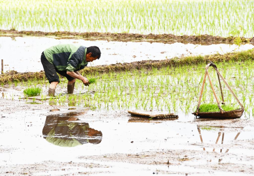 4月19日,湖南省永州市江永縣瀟浦鎮(zhèn)接龍橋村農(nóng)民在田間搶插早稻秧苗。新華社發(fā)