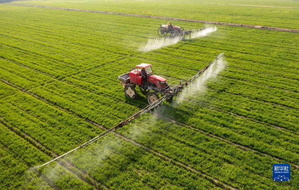 在江蘇省海安市大公鎮(zhèn)賁集村,村民駕駛植保機(jī)械在小麥田間進(jìn)行噴灑藥物作業(yè)(3月9日攝,無(wú)人機(jī)照片)。新華社發(fā)(翟慧勇 攝)