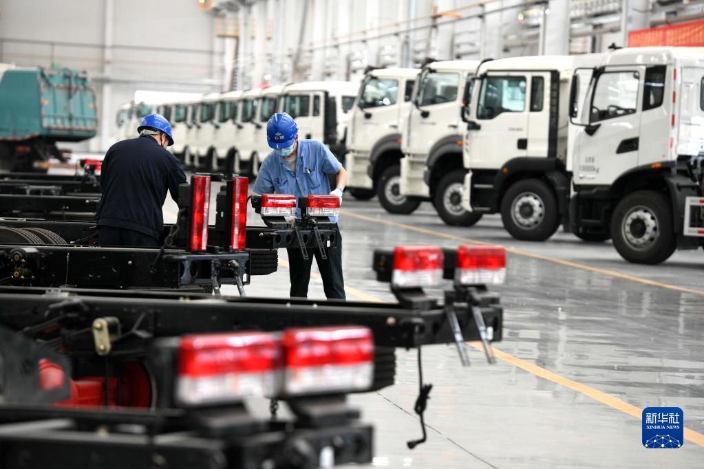 在位于石家莊市欒城區(qū)的石家莊煤礦機(jī)械有限責(zé)任公司車間內(nèi),工作人員組裝新能源環(huán)衛(wèi)車(4月12日攝)。新華社記者 李繼偉 攝