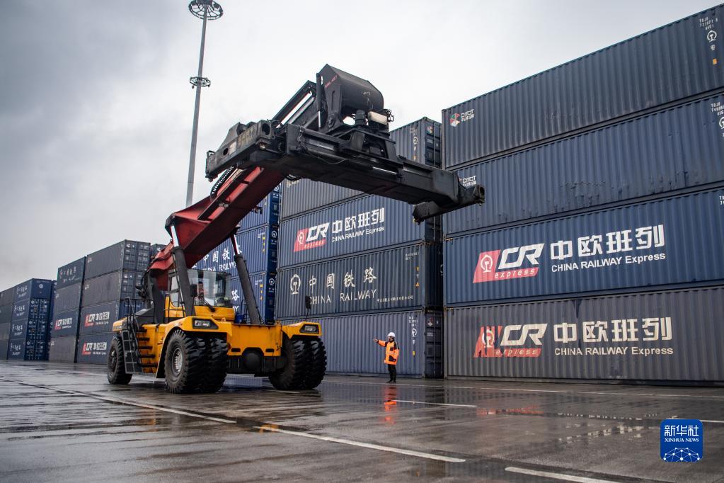 中歐班列起點(diǎn)聯(lián)合巡邏隊(duì)成員在重慶團(tuán)結(jié)村中心站貨場(chǎng)對(duì)作業(yè)車輛進(jìn)行現(xiàn)場(chǎng)指揮(1月25日攝)。新華社記者 唐奕 攝