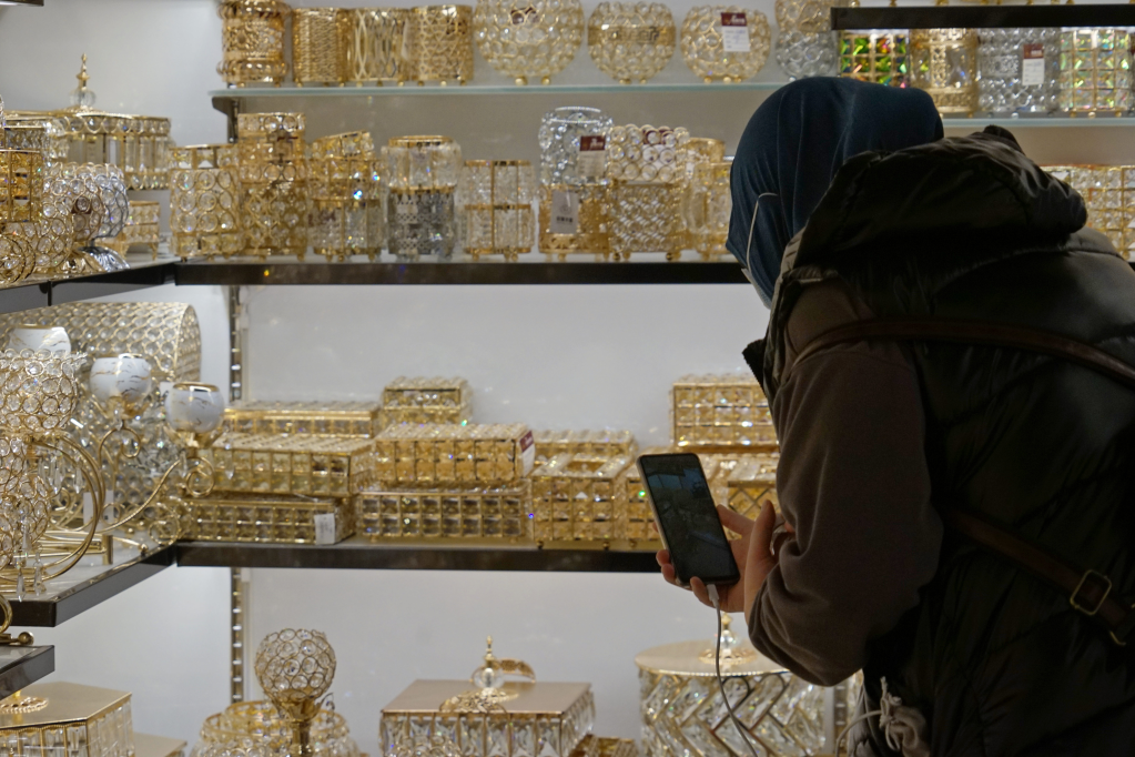 義烏國際商貿(mào)城一家水晶商鋪內(nèi),業(yè)務員小丁正在貨架前進行遠程視頻連線,手機的另一頭連著巴勒斯坦。受疫情影響,海外客商來華不便,遠程直播成為其采購之“眼睛”?!翱蛻魮倪@個燈臺尺寸比較大,運費會不會比較貴?”業(yè)務員小丁問。“沒問題,主體和燈座可以拆卸,包裝不占空間?!鄙啼佖撠熑藙s斌立即回復。