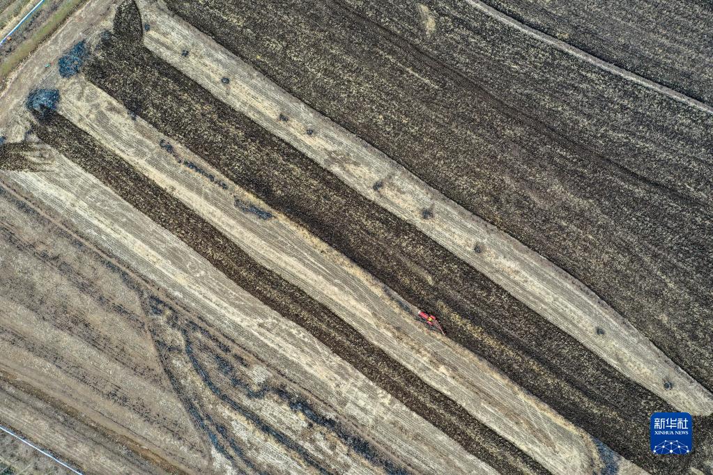 在吉林省吉林市昌邑區(qū)孤店子鎮(zhèn)紅衛(wèi)村,春新生態(tài)家庭農場農民駕駛農機耕地(4月26日攝,無人機照片)。新華社記者 張楠 攝