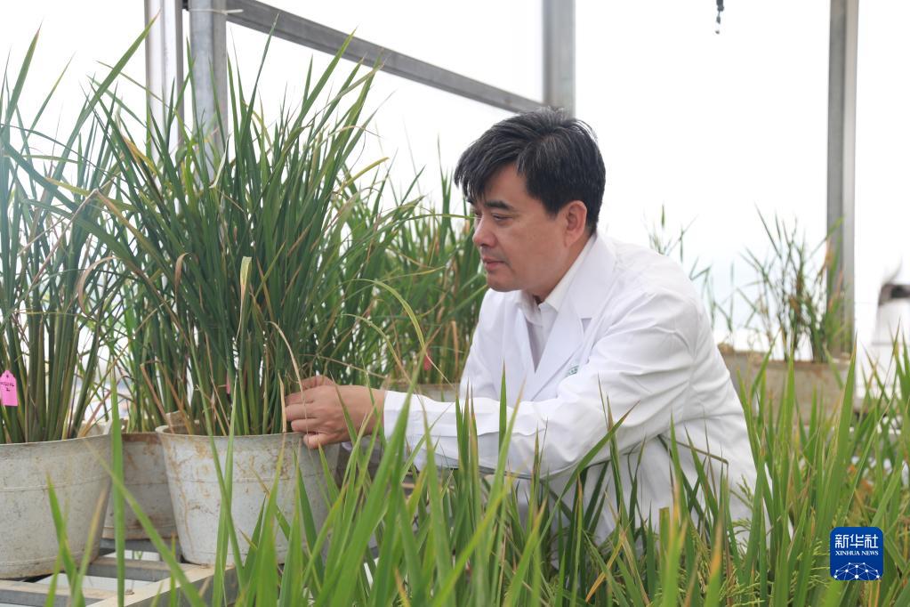 中國(guó)工程院院士、湖南省農(nóng)業(yè)科學(xué)院黨委書(shū)記柏連陽(yáng)在實(shí)驗(yàn)室查看水稻生長(zhǎng)情況(資料照片)。新華社發(fā)(受訪者供圖)
