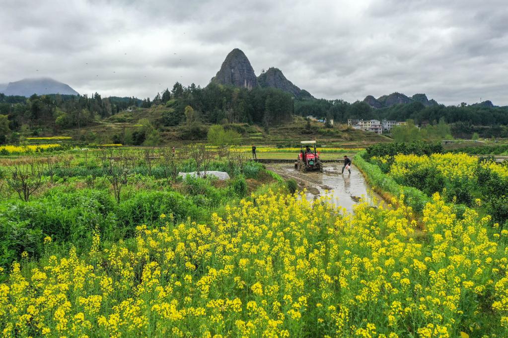3月20日,湖南省湘西土家族苗族自治州龍山縣興隆街道,農(nóng)民在田間耕作(無人機照片)。新華社發(fā)(曾祥輝攝)