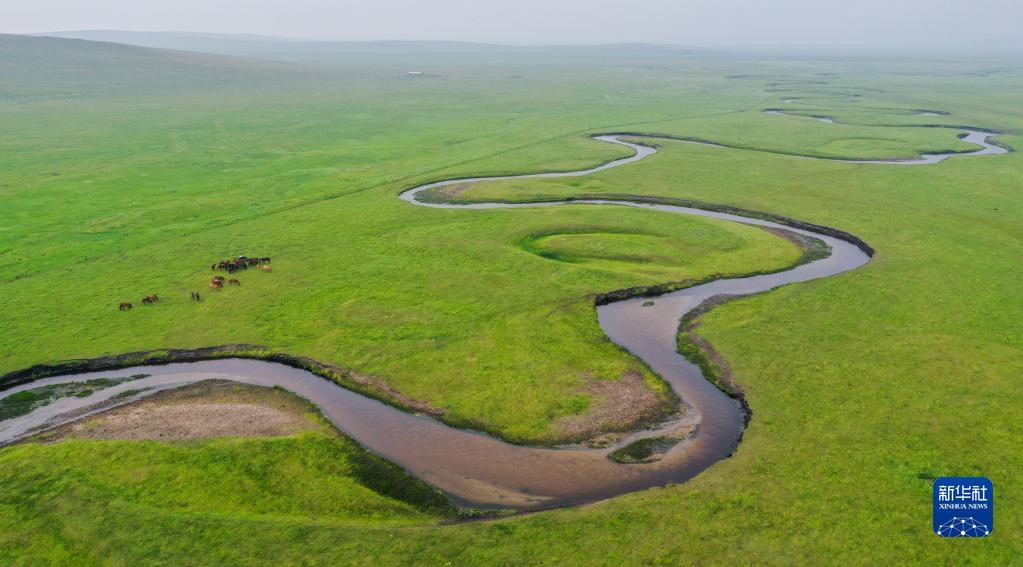 這是內(nèi)蒙古錫林郭勒盟東烏珠穆沁旗乃林高勒的草原風光(2021年7月12日攝,無人機照片)。新華社記者 連振 攝