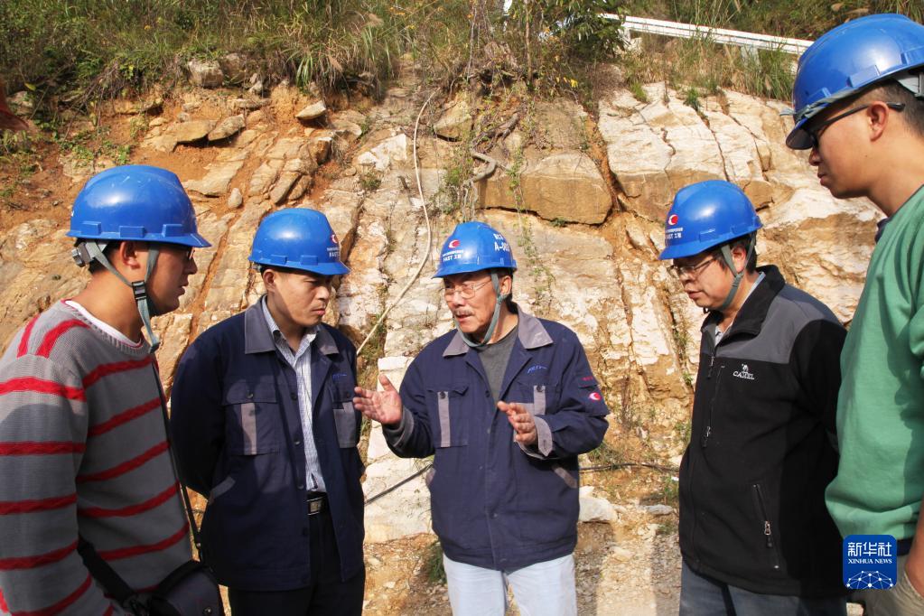 天文學(xué)家南仁東(中)與工程技術(shù)人員在大窩凼施工現(xiàn)場檢查施工進(jìn)展(2014年12月1日攝)。新華社發(fā)(中科院國家天文臺供圖)