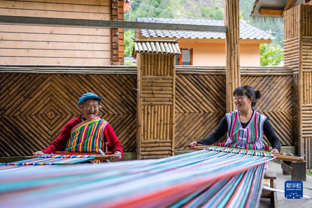 在云南省貢山獨(dú)龍族怒族自治縣獨(dú)龍江鄉(xiāng)迪政當(dāng)村,獨(dú)龍族老人李文仕(左)和女兒在編織獨(dú)龍?zhí)海?月10日攝)。新華社記者 曹夢(mèng)瑤 攝