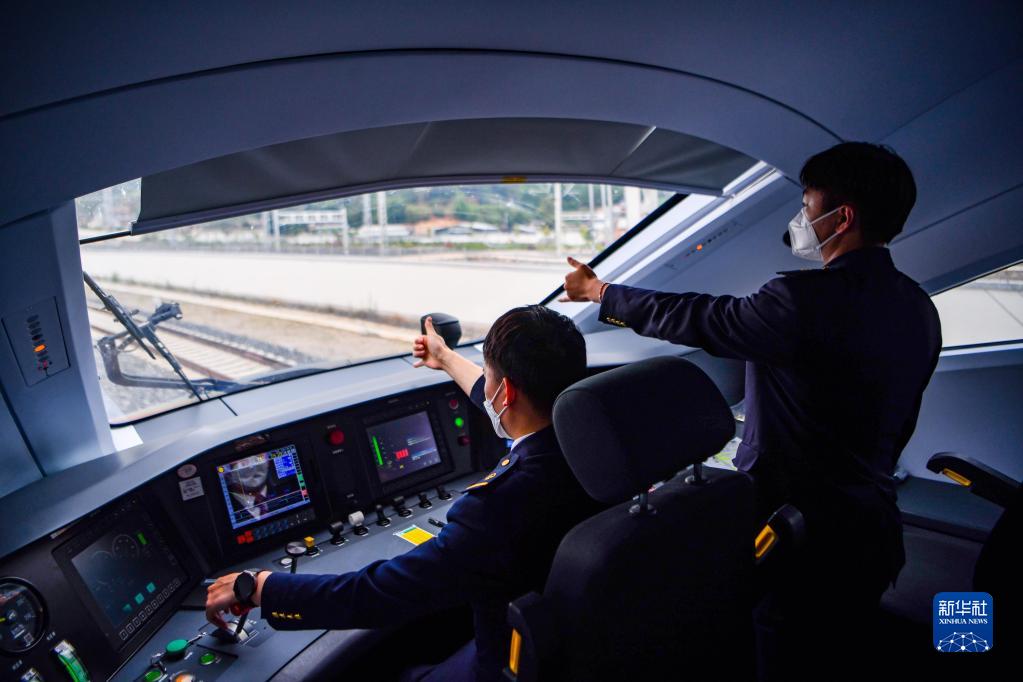 列車司機(jī)駕駛復(fù)興號(hào)列車行駛在中老鐵路上(6月1日攝)。新華社記者 江文耀 攝