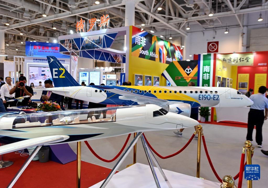 參觀者從2021金磚國(guó)家新工業(yè)革命展展出的飛機(jī)模型前走過(2021年9月8日攝)。新華社記者 林善傳 攝