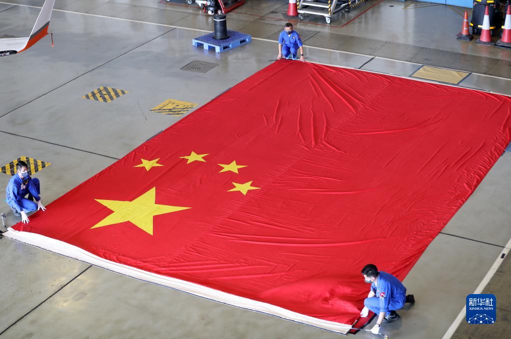 直升機(jī)務(wù)教官蔡澤民套上鞋套,戴上白手套,拿著夾有《國旗及國徽條例》的文件夾,一一對照檢查。國旗是在具備資質(zhì)的廠家專門定制的,規(guī)格規(guī)范都有嚴(yán)格要求。國旗大,就有拼接。蔡澤民主要查看色澤是否飽滿和均勻,接縫是否平整,四條邊上有沒有線頭等,特別要注意的是,五顆星星處不可有接縫。一番操作下來,后背已然濕透。