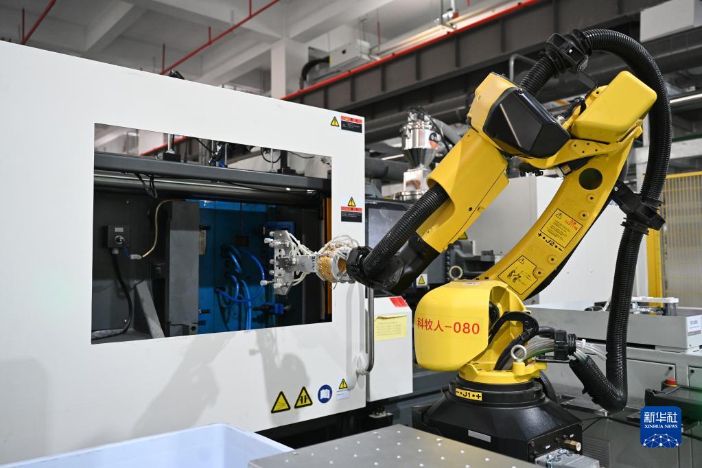 在福建省南安市九牧高端燈塔工廠,機械臂在流水線上作業(yè)(2022年5月18日攝)。新華社發(fā)(周義 攝)