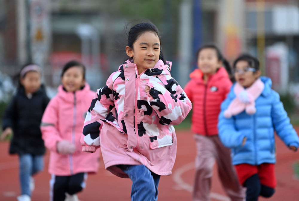 ↑在天津市河西區(qū)德賢小學(xué),學(xué)生在課后素質(zhì)拓展課上跑步鍛煉(2021年11月11日攝)。