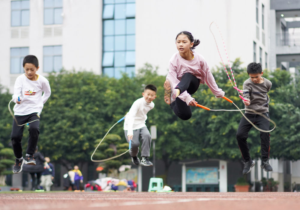 ↑重慶市九龍坡區(qū)西彭鎮(zhèn)第一小學(xué)校學(xué)生在體育課上進行花樣跳繩訓(xùn)練(2020年12月9日攝)。