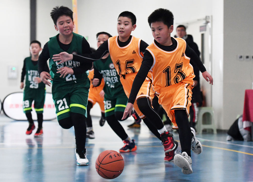 ↑懷柔區(qū)第三小學(xué)選手在2021年北京市第一屆小學(xué)生籃球比賽中帶球進攻(2021年12月11日攝)。