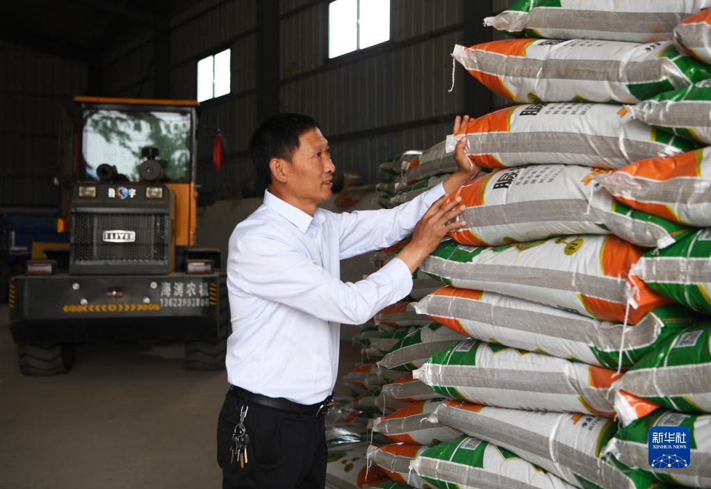 在河南省南陽(yáng)市唐河縣湖陽(yáng)鎮(zhèn)張灣村,種糧大戶趙建成在整理倉(cāng)庫(kù)里的化肥,準(zhǔn)備夏收之后的夏種(2022年5月26日攝)。新華社記者 張浩然 攝