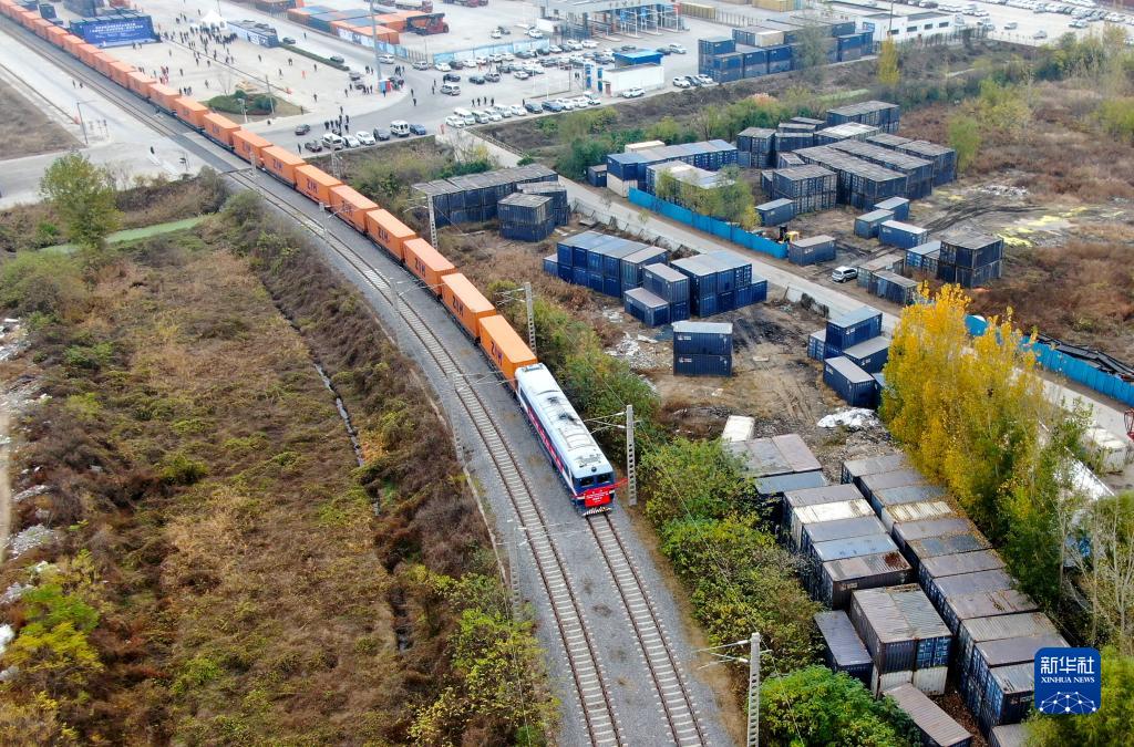 中國(guó)鄭州至芬蘭赫爾辛基的中歐班列駛出中國(guó)鐵路鄭州局集團(tuán)有限公司圃田車站(2020年11月20日,無(wú)人機(jī)照片)。新華社記者 郝源 攝