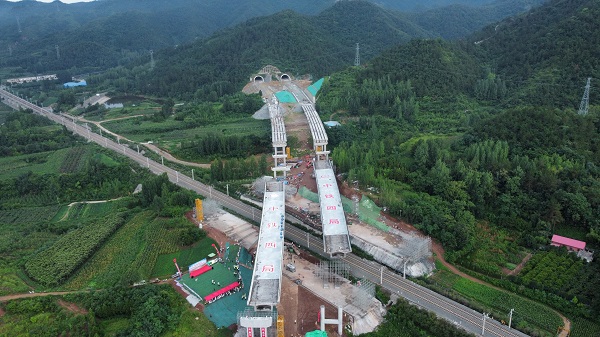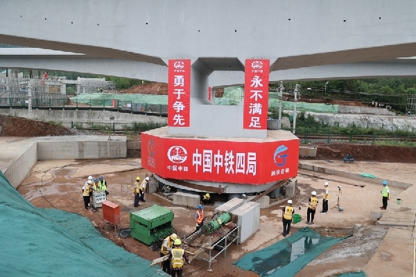 據(jù)悉,由中鐵四局承建的澠淅高速跨浩吉鐵路轉(zhuǎn)體梁全長140米,橋面寬13米,主墩高5米,是澠淅高速的控制性工程之一。該轉(zhuǎn)體梁是國內(nèi)為數(shù)不多的雙幅跨鐵路曲線梁,且距離鐵路線僅有8米,施工難度大,安全隱患多,安全卡控要求嚴。為實現(xiàn)精準對接,項目部分別在2個T構(gòu)主墩安裝千斤頂和液壓泵,同步順時針轉(zhuǎn)體44.5°和42.3°。在歷經(jīng)正常轉(zhuǎn)動、減速轉(zhuǎn)動、點動轉(zhuǎn)動三個階段后,歷時100分鐘精確完成轉(zhuǎn)體。