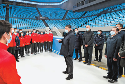 首都體育館是國(guó)內(nèi)第一座人工室內(nèi)冰場(chǎng),經(jīng)過(guò)改擴(kuò)建已具備冬奧會(huì)短道速滑和花樣滑冰比賽訓(xùn)練條件。習(xí)近平走到訓(xùn)練場(chǎng)邊,察看場(chǎng)館改造情況,同國(guó)家花樣滑冰隊(duì)和短道速滑隊(duì)運(yùn)動(dòng)員、教練員代表親切交流。習(xí)近平指出,建設(shè)體育強(qiáng)國(guó),是全面建設(shè)社會(huì)主義現(xiàn)代化國(guó)家的一個(gè)重要目標(biāo)。體育強(qiáng)國(guó)的基礎(chǔ)在于群眾體育。要通過(guò)舉辦北京冬奧會(huì)、冬殘奧會(huì),推動(dòng)我國(guó)冰雪運(yùn)動(dòng)跨越式發(fā)展,補(bǔ)缺項(xiàng)、強(qiáng)弱項(xiàng),逐步解決競(jìng)技體育強(qiáng)、群眾體育弱和夏強(qiáng)冬弱冰強(qiáng)雪弱的問(wèn)題,推動(dòng)新時(shí)代體育事業(yè)高質(zhì)量發(fā)展。提高現(xiàn)代競(jìng)技體育水平,既要靠氣力,也要靠技力。運(yùn)動(dòng)員要有為國(guó)爭(zhēng)光、勇創(chuàng)佳績(jī)的志氣,夏練三伏、冬練三九,加強(qiáng)技術(shù)創(chuàng)新,學(xué)習(xí)借鑒國(guó)外先進(jìn)理念和技術(shù),不斷提高訓(xùn)練和比賽水平。